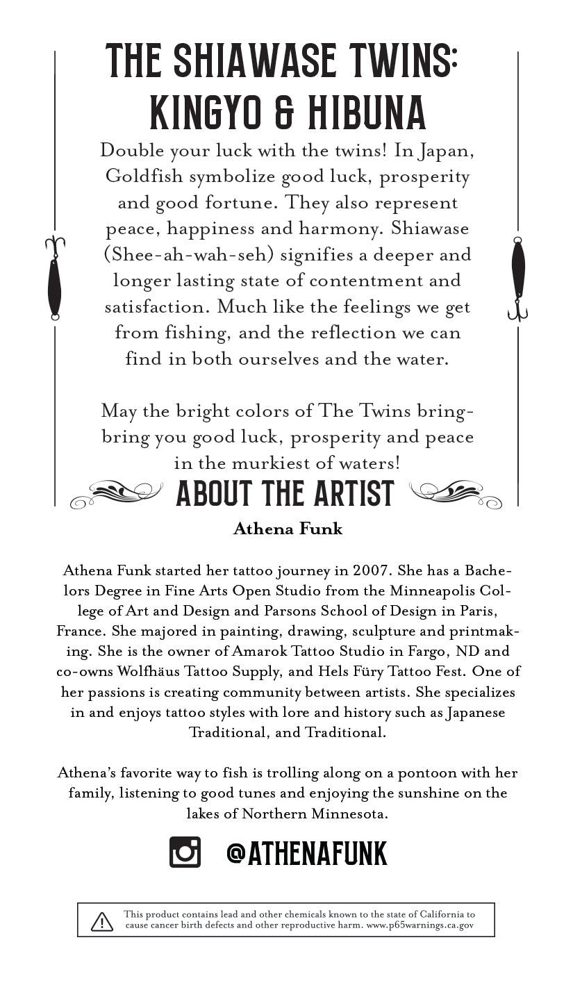 The twelfth Artist Signature Set is from artist Athena Funk a tattoo artist from Amarok Tattoo in Fargo, North Dakota. These casting spoons are for all types of fishing from lakes and rivers to bays and beaches. The set features 2 lures each with different custom "The Shiawase Twins: Kingyo & Hibuna" artwork.